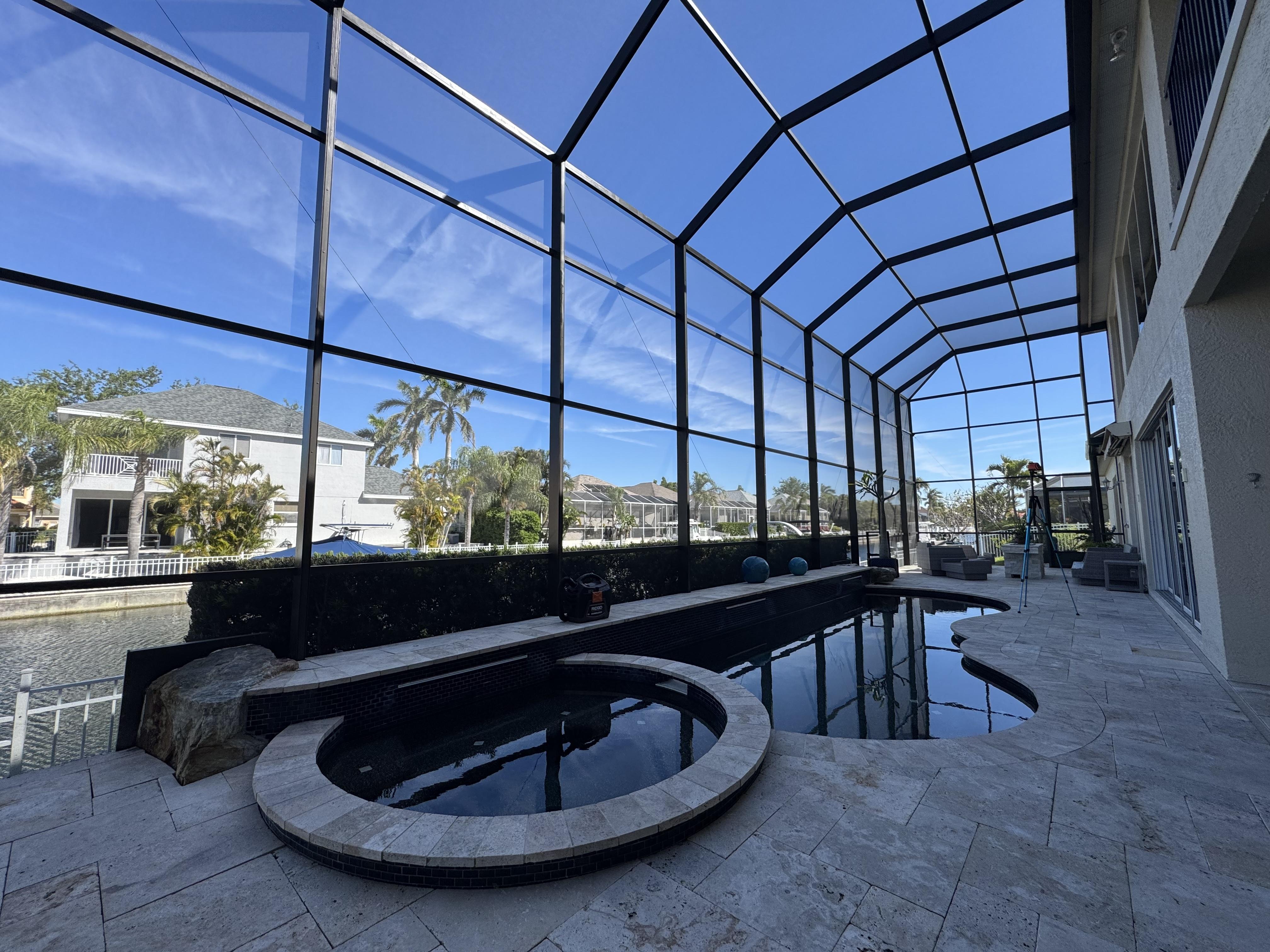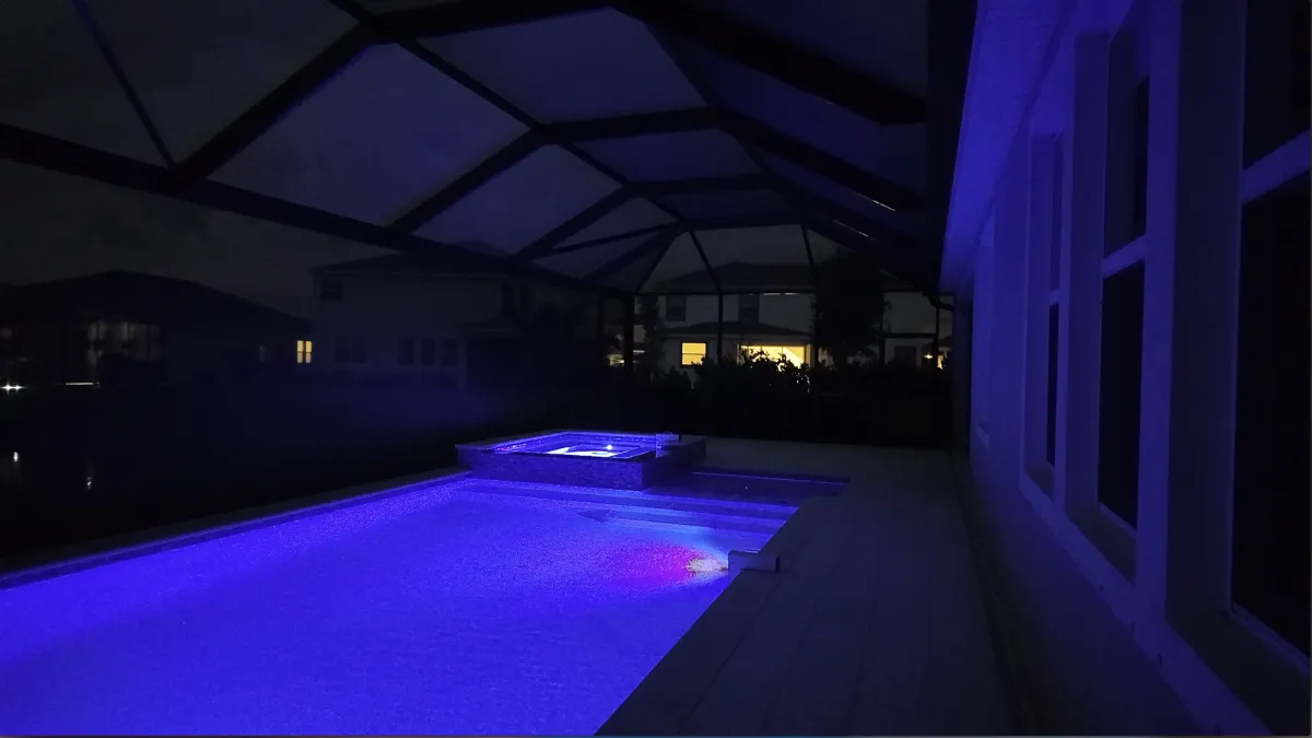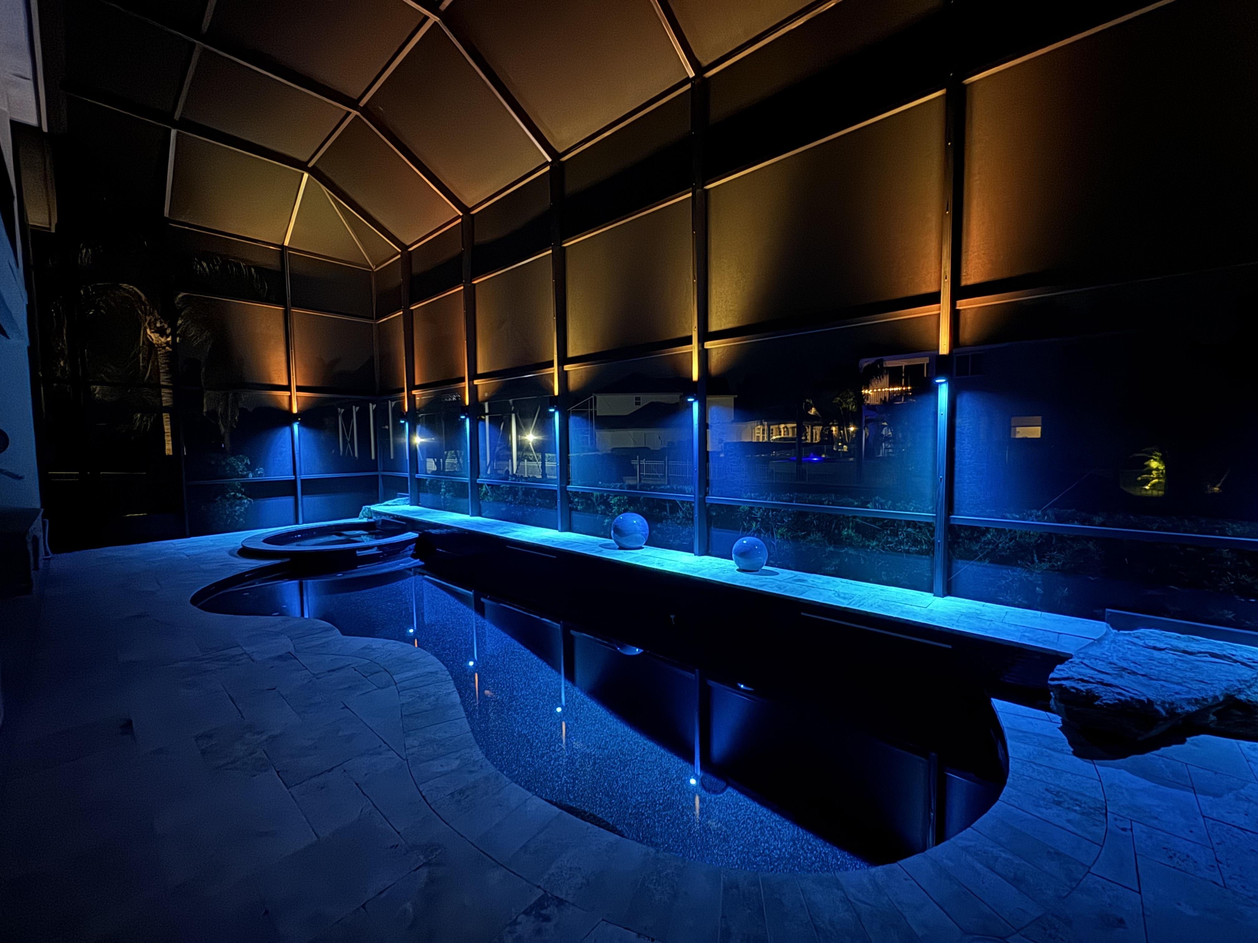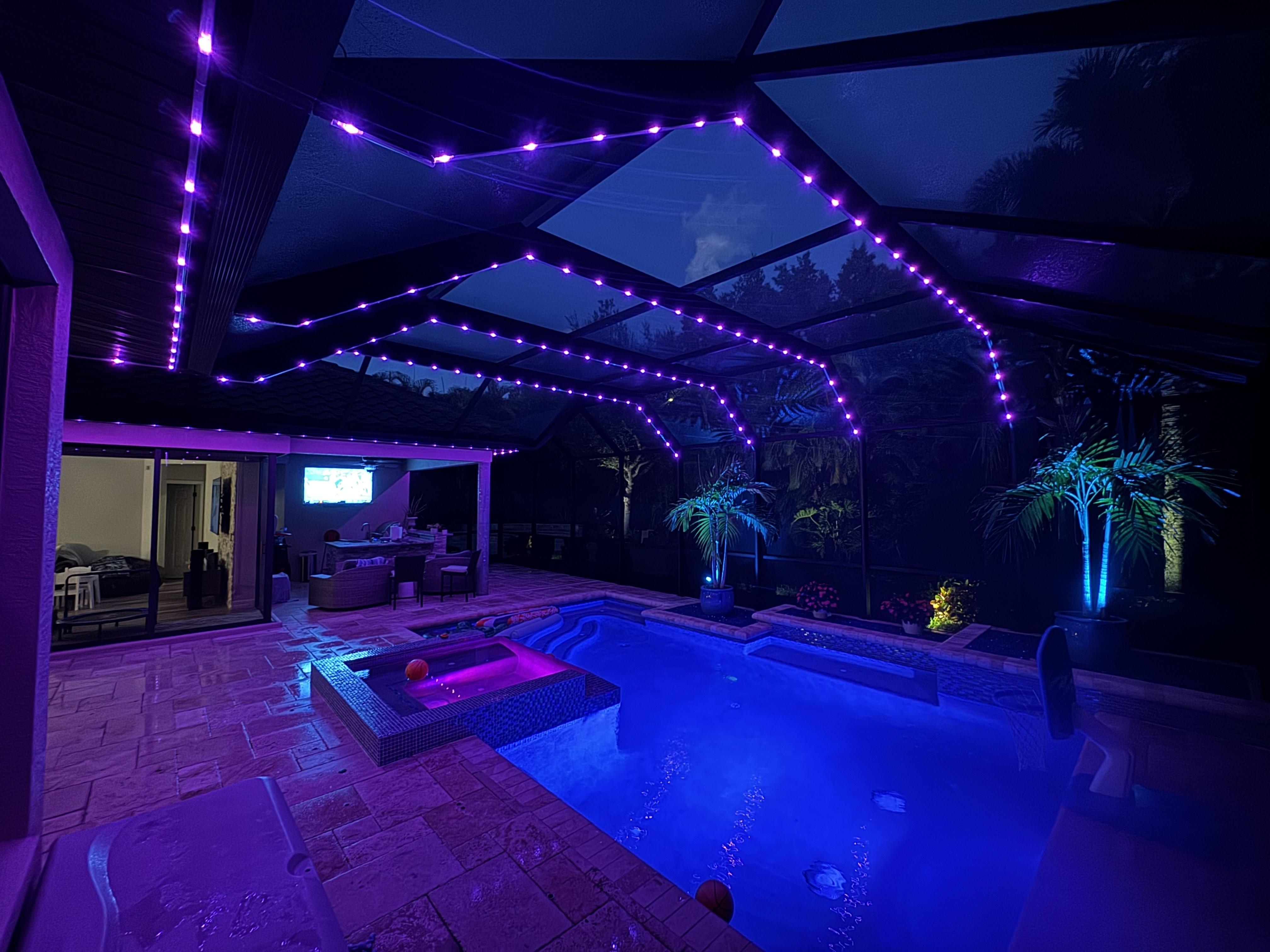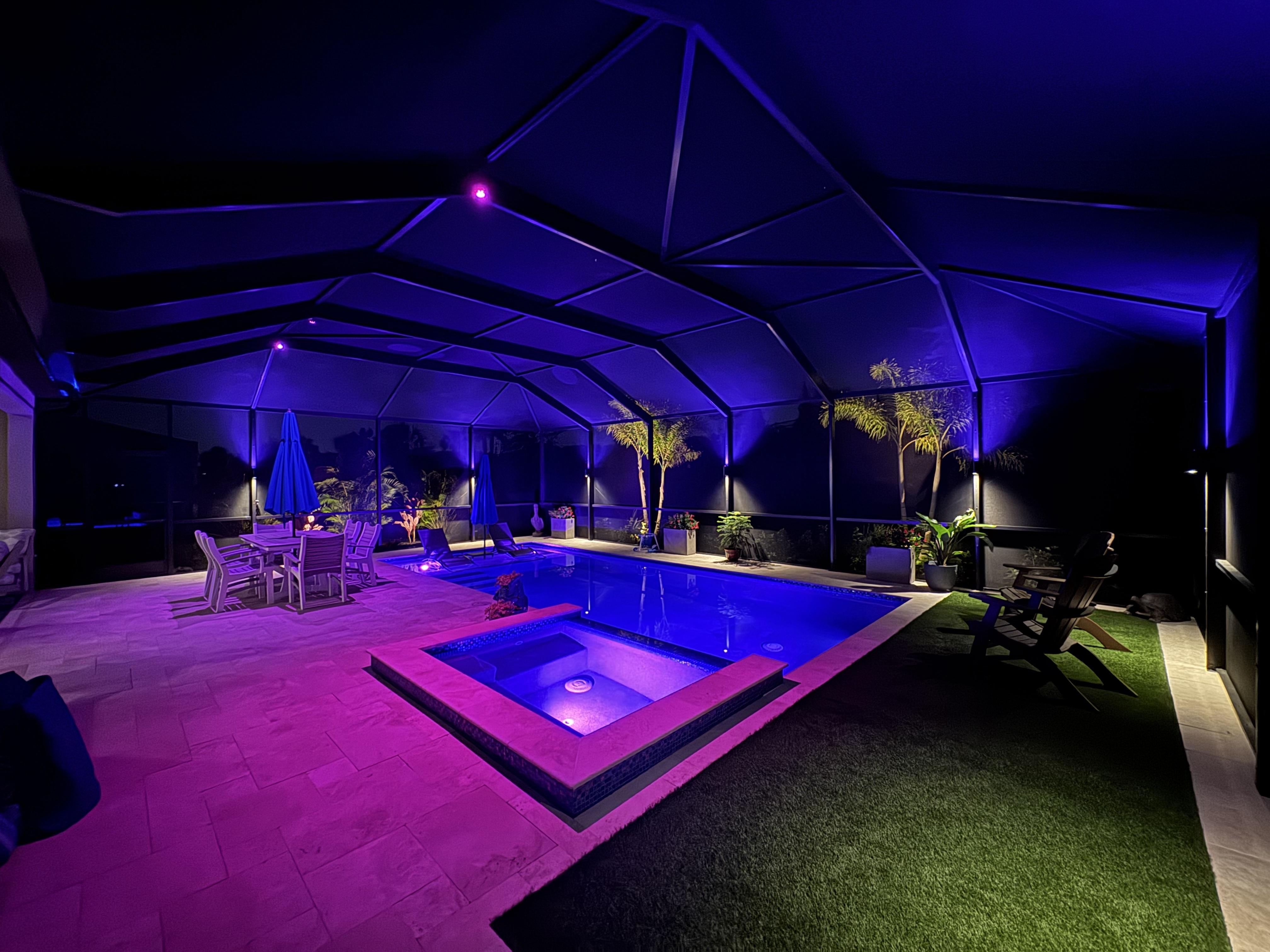 Our Pool Cage Trim Lights bring a sleek, permanent lighting solution to your lanai or pool enclosure. Professionally installed along the beams of your cage, these low-profile lights are nearly invisible by day—but come to life at night with vibrant, customizable illumination. Controlled via Bluetooth app, you can set the perfect tone for any evening, from relaxing nights to lively gatherings. Designed for all-season use, these lights combine elegance, durability, and convenience—no bulbs to swap, no hassle, just beautiful lighting every night.